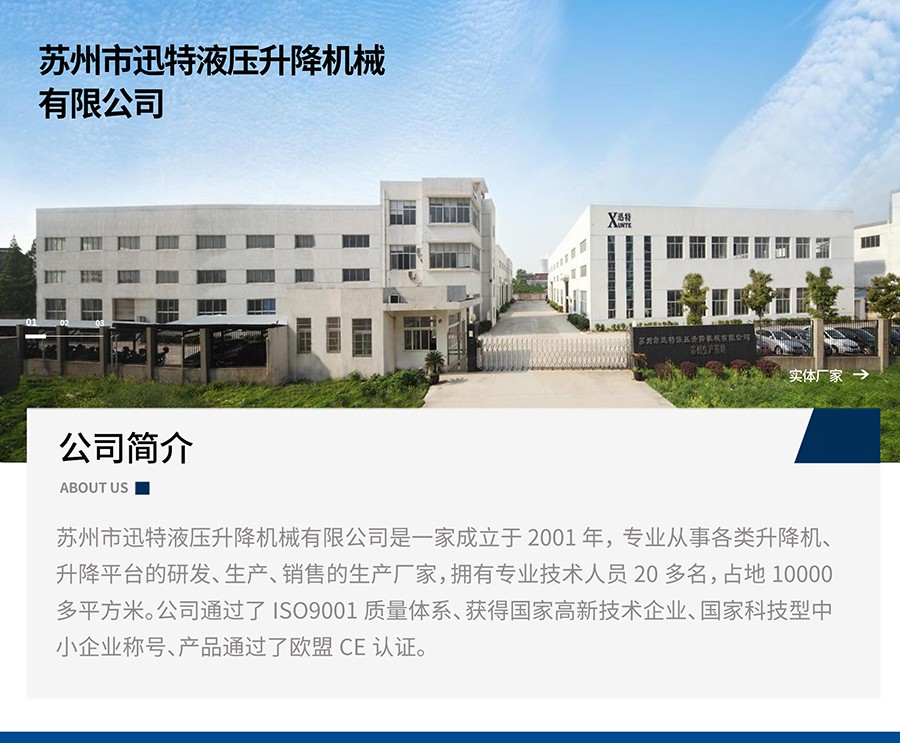 歡迎進入蘇州市迅特液壓升降機械有限公司官網(wǎng),提供升降臺,升降平臺,液壓升降機,移動式升降機,電動升降機,液壓升降平臺,登車橋等升降解決方案!